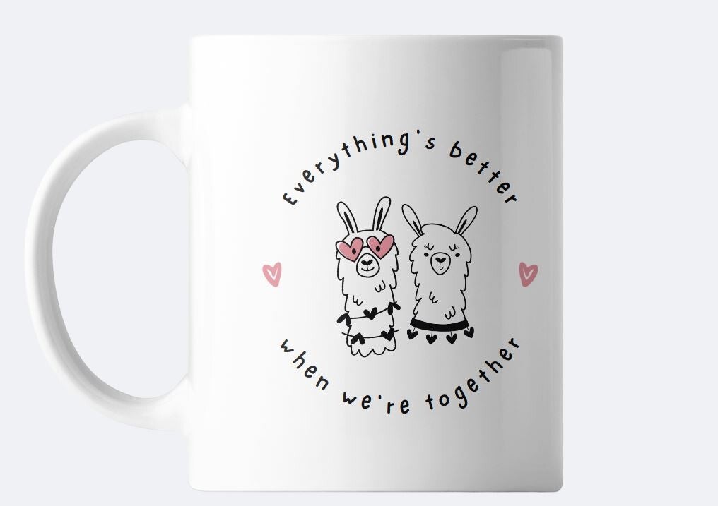 Feiere die besonderen Momente des Zusammenseins mit dieser charmanten Tasse! Das liebevolle Design zeigt zwei fröhliche Llamas und die herzerwärmende Botschaft: "Everything's better when we're together."